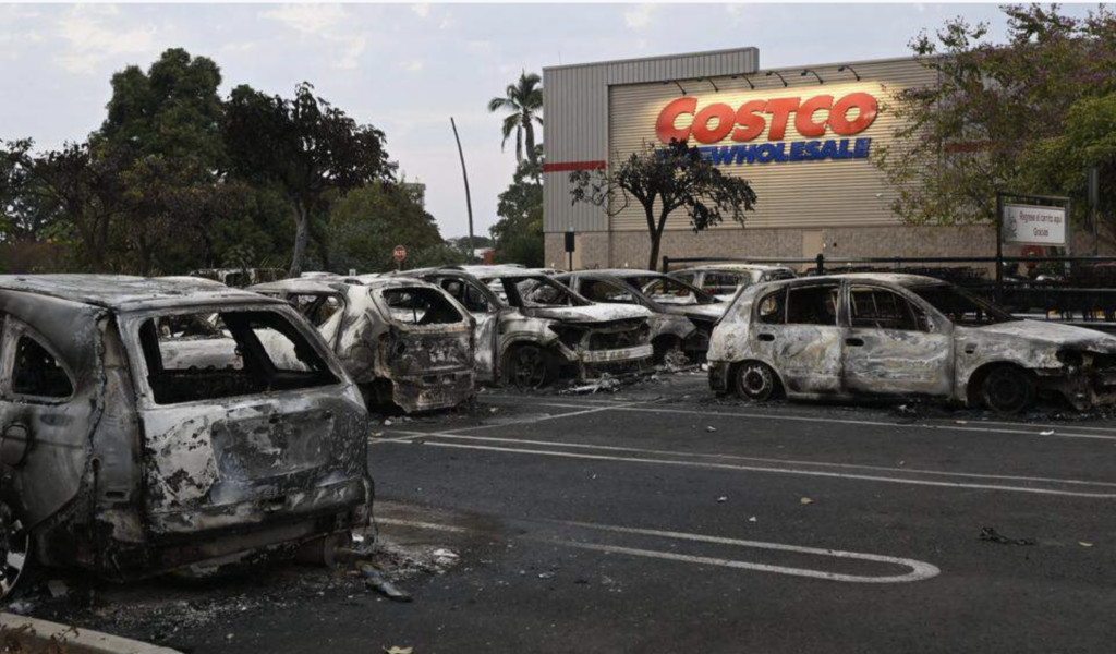 Autos quemados en el estacionamiento de una tienda Costco en Puerto Vallarta, Jalisco, México, el 23 de febrero de 2026. México ha desplegado 10,000 soldados para sofocar los enfrentamientos provocados por el asesinato del narcotraficante más buscado del país, que han dejado decenas de muertos, informaron las autoridades el 23 de febrero. Nemesio “El Mencho” Oseguera, líder del Cártel Jalisco Nueva Generación (CJNG), resultó herido el 22 de febrero en un tiroteo con soldados en Tapalpa, Jalisco, y murió mientras era trasladado a la Ciudad de México, informó el ejército. AFP