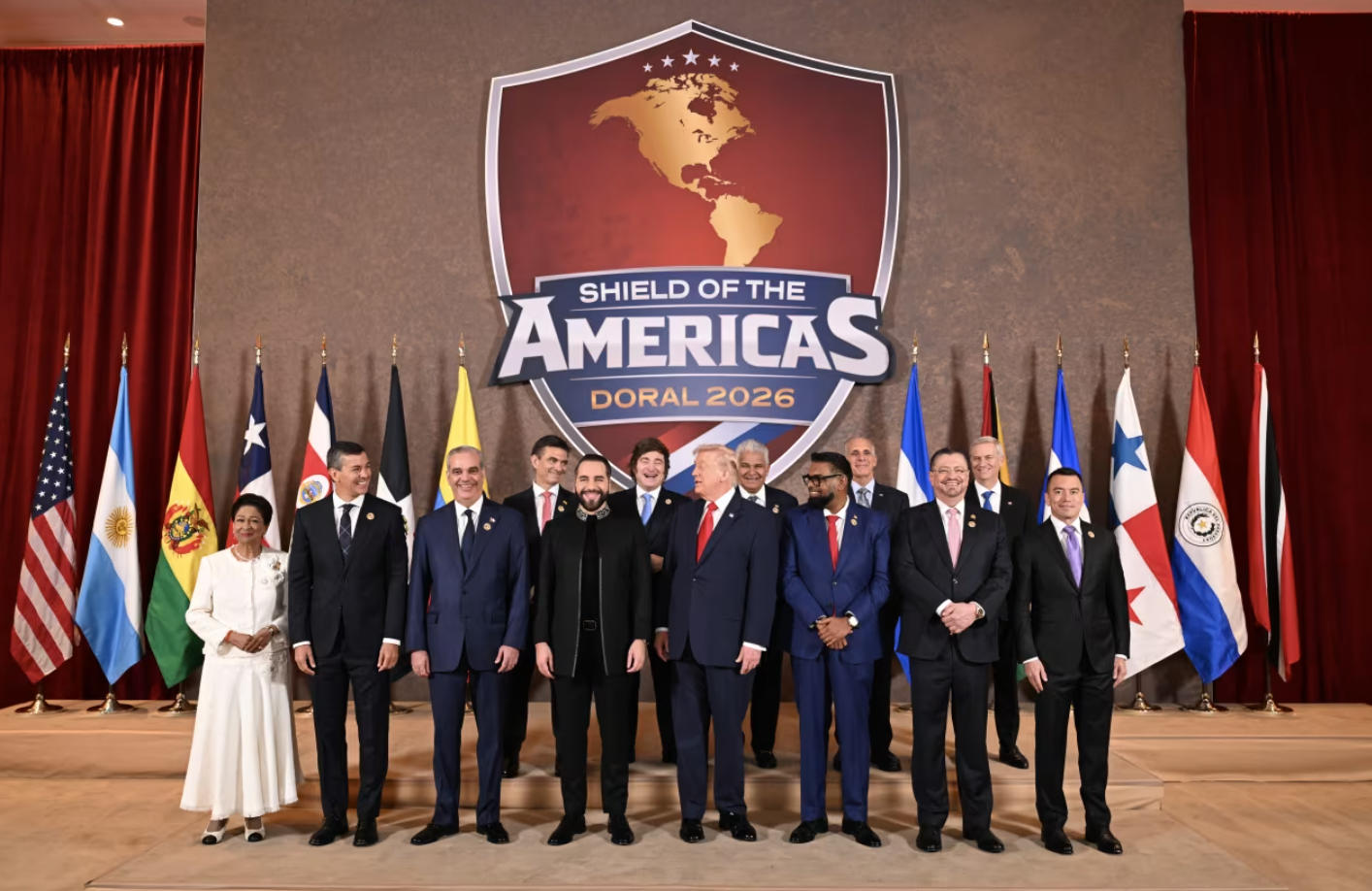 Los primeros en llegar al evento fueron el presidente de Panamá, José Raúl Mulino; el presidente electo de Chile, José Antonio Kast, quien asumirá el cargo el próximo miércoles; la primera ministra de Trinidad y Tobago, Kamla Persad-Bissessar, y el presidente de Honduras, Nasry Asfura.