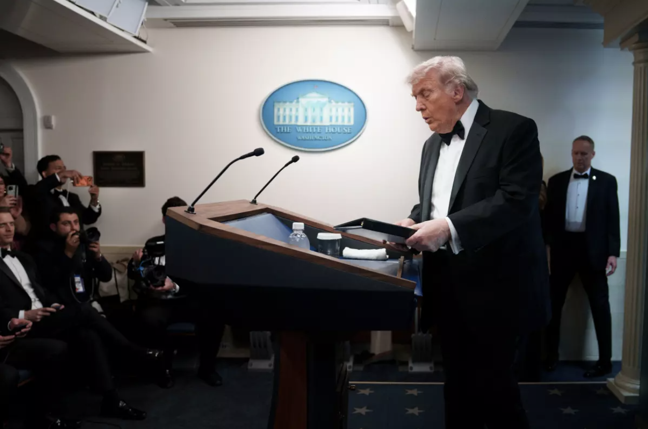 Trump llegó a un evento donde los dirigentes de una nación en guerra se mezclaban con celebridades, periodistas e incluso una marioneta —Triumph the Insult Comic Dog— en una cena que típicamente genera debate sobre si la relación entre los periodistas y sus fuentes debería incluir socializar juntos y dejar de lado relaciones a veces adversarias.